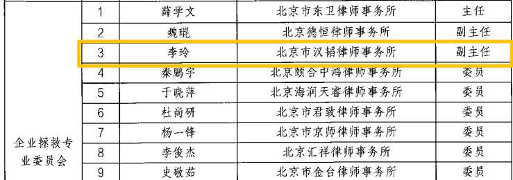 汉韬荣誉丨汉韬所创始合伙人李玲律师担任第二届北京市破产管理人协会企业拯救专业委员会副主任