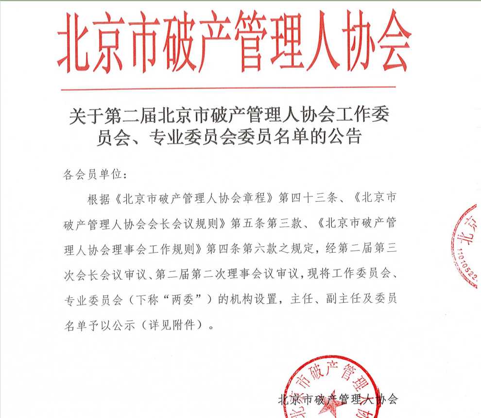 2025年9月5日,北京市破产管理人协会公布第二届工作委员会、专业委员会的机构设置及人员名单,根据公告,第二届北京市破产管理人协会专业委员会下设企业退出专业委员会、企业拯救专业委员会等5个专业委员会,北京市汉韬律师事务所创始合伙人李玲律师担任企业拯救专业委员会副主任。